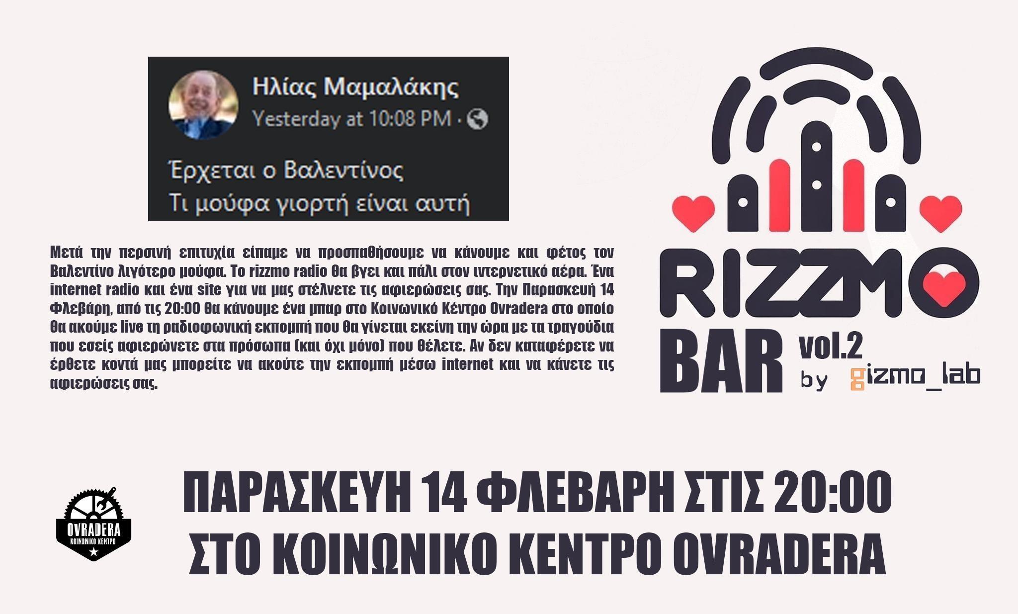 Μετά την περσινή επιτυχία είπαμε να προσπαθήσουμε να κάνουμε και φέτος τον Βαλεντίνο λιγότερο μούφα. Το rizzmo radio θα βγει και πάλι στον ιντερνετικό αέρα. Ένα internet radio και ένα site για να μας στέλνετε τις αφιερώσεις σας. Την Παρασκευή 14 Φλεβάρη, από τις 20:00 θα κάνουμε ένα μπαρ στο Κοινωνικό Κέντρο Ovradera στο οποίο θα ακούμε live τη ραδιοφωνική εκπομπή που θα γίνεται εκείνη την ώρα με τα τραγούδια που εσείς αφιερώνετε στα πρόσωπα (και όχι μόνο) που θέλετε. Αν δεν καταφέρετε να έρθετε κοντά μας μπορείτε να ακούτε την εκπομπή μέσω internet και να κάνετε τις αφιερώσεις σας.